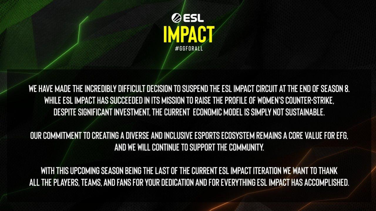 Турнирный оператор заявил о приостановке работы лиги ESL Impact, которая была шансом на выход в топ для женских команд – все из-за отсутствия финансирования и внимания потенциальных спонсоров.