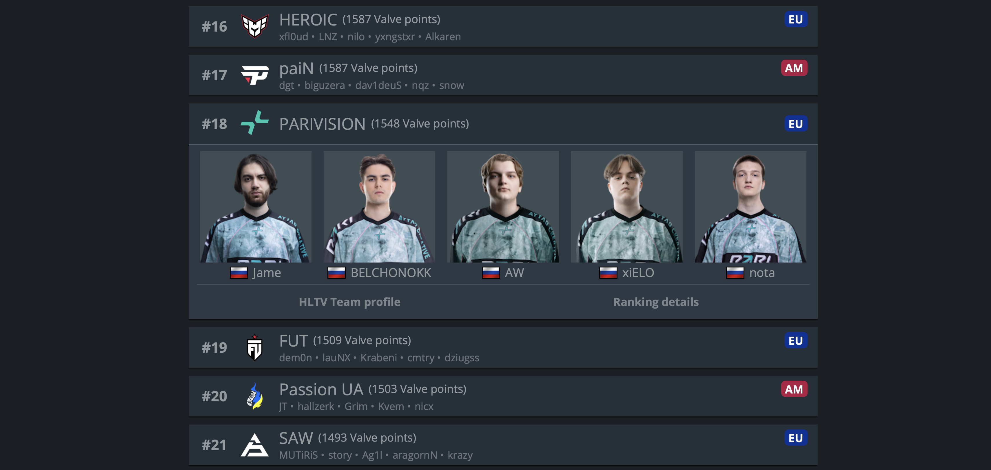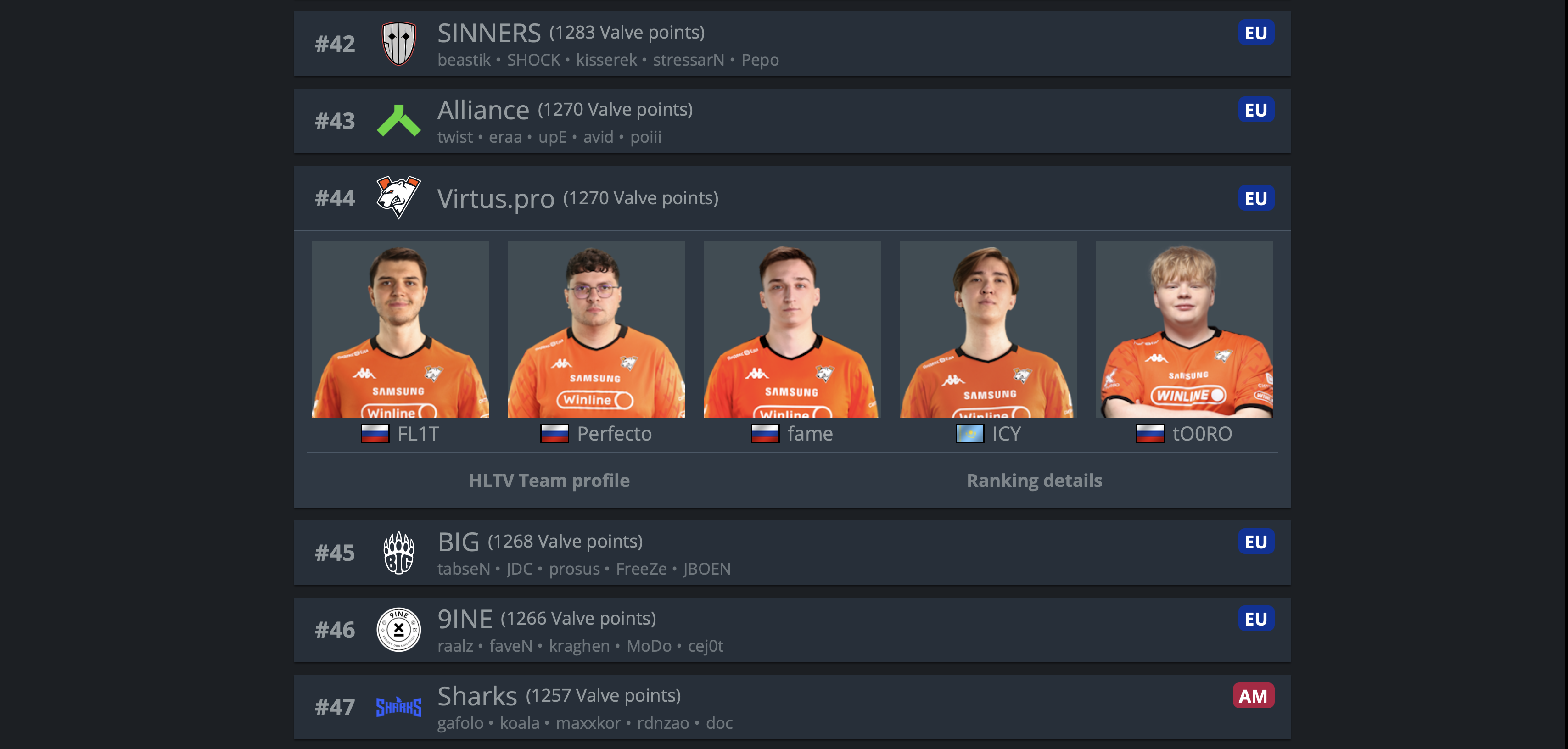 Сейчас PARIVISION занимают 18-ое место в рейтинге Valve, а Virtus Pro расположились на скромной 44-ой позиции.
