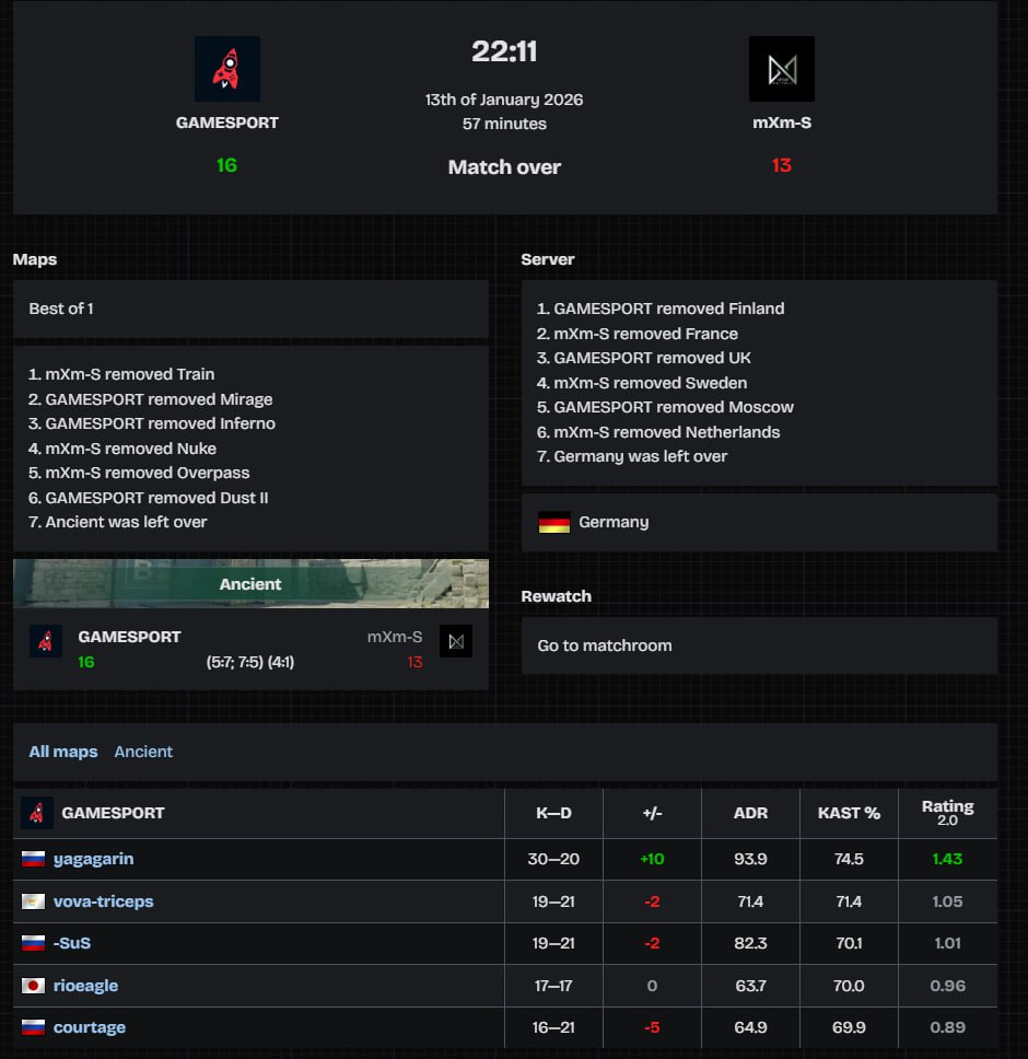 Первый матч прошел в максимальной борьбе и мог закончиться поражением уже в основное время. Однако капитан команды yagagarin взял ситуацию в свои руки – вывел противостояние на овертаймы, набил 30 фрагов и принес ростеру победу со счетом 16-13.