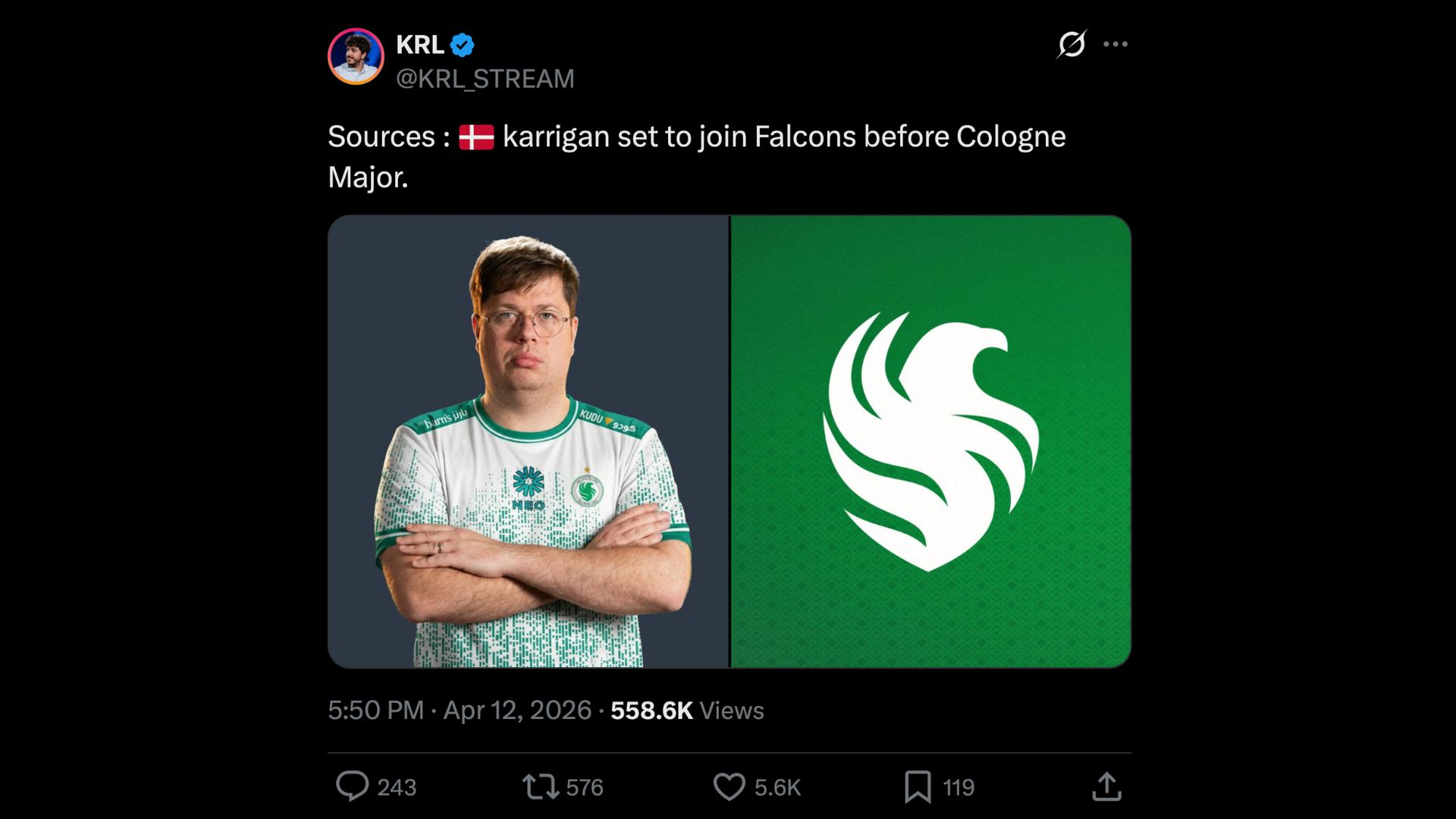 Слухом поделился надежный инсайдер KRL – скорее всего, переход "легендарного капитана", убившего FaZe, отправит туда и Falcons с m0NESY + kyousuke на борту.