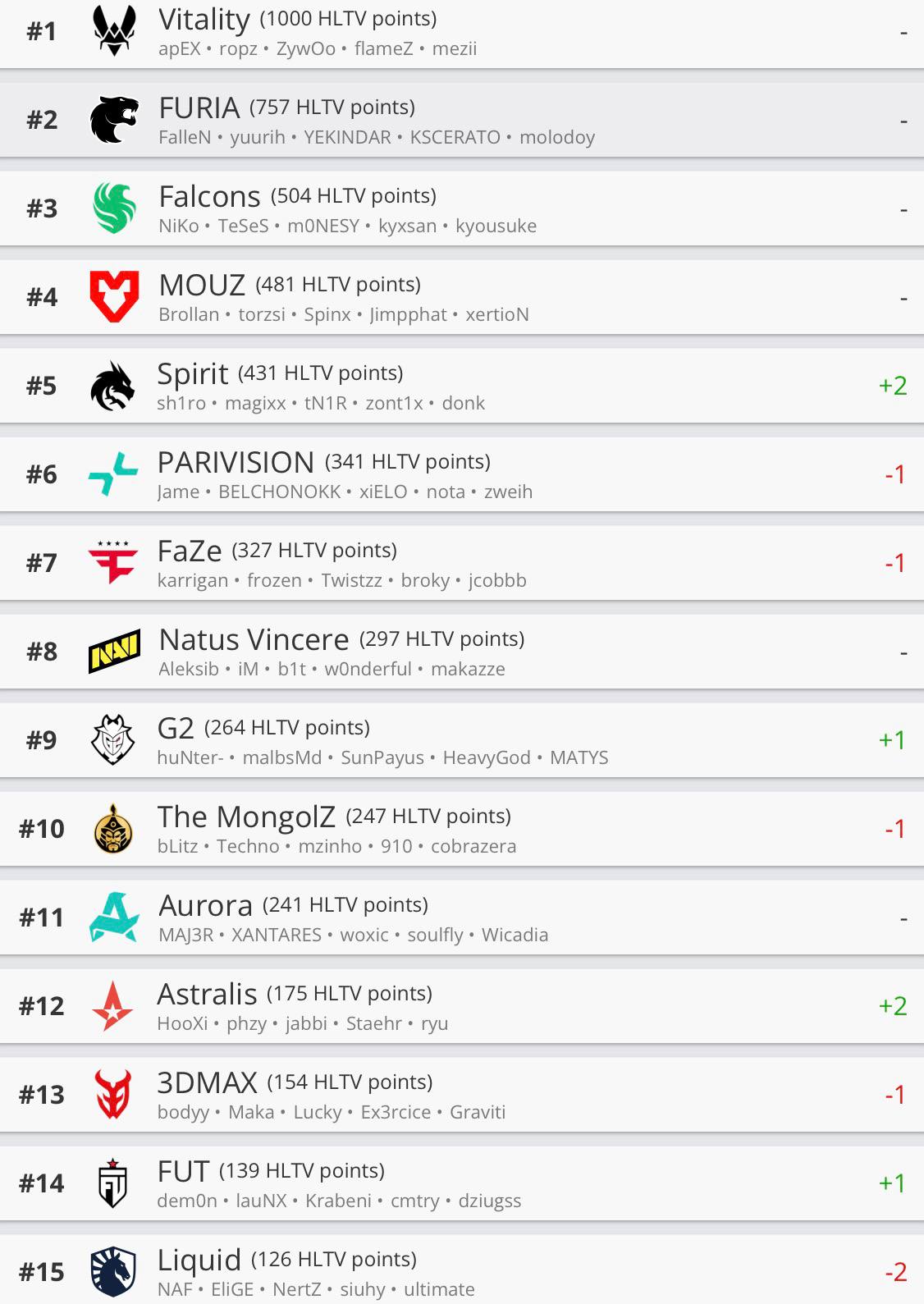 Из самых заметных изменений – Spirit вернулись в топ-5, а команда s1mple магическим образом получила +1 место в рейтинге.