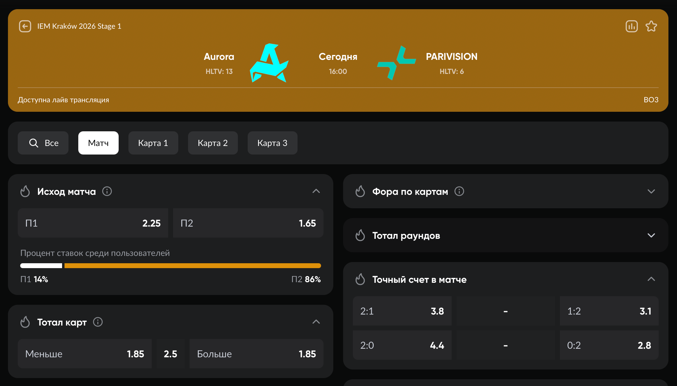 Несмотря на сложности в первом матче на IEM Krakow, именно PARIVISION стали фаворитами предстоящего матча верхней сетки – вот основные коэффициенты от букмекеров: