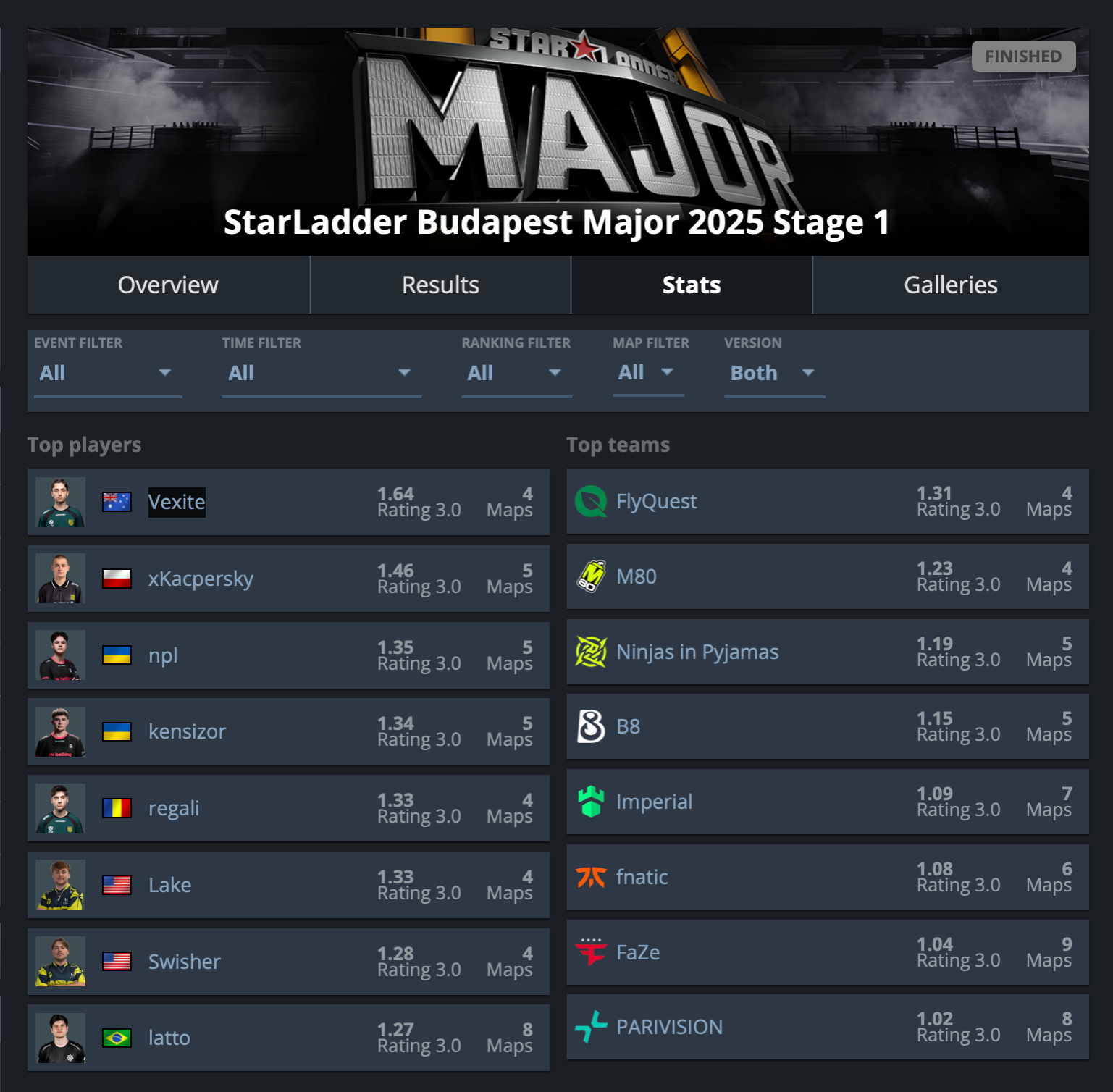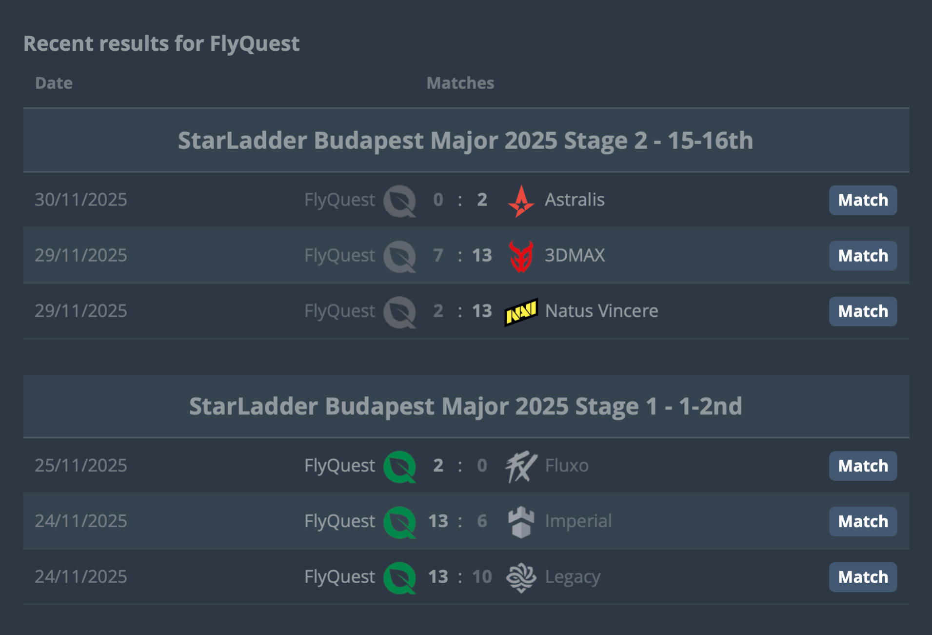 FlyQuest уже вылетели из борьбы за кубок StarLadder Major 2025 – команда по CS2 не смогла выиграть не единой карты в Stage 2 и покинула турнир со статистикой 0:3.