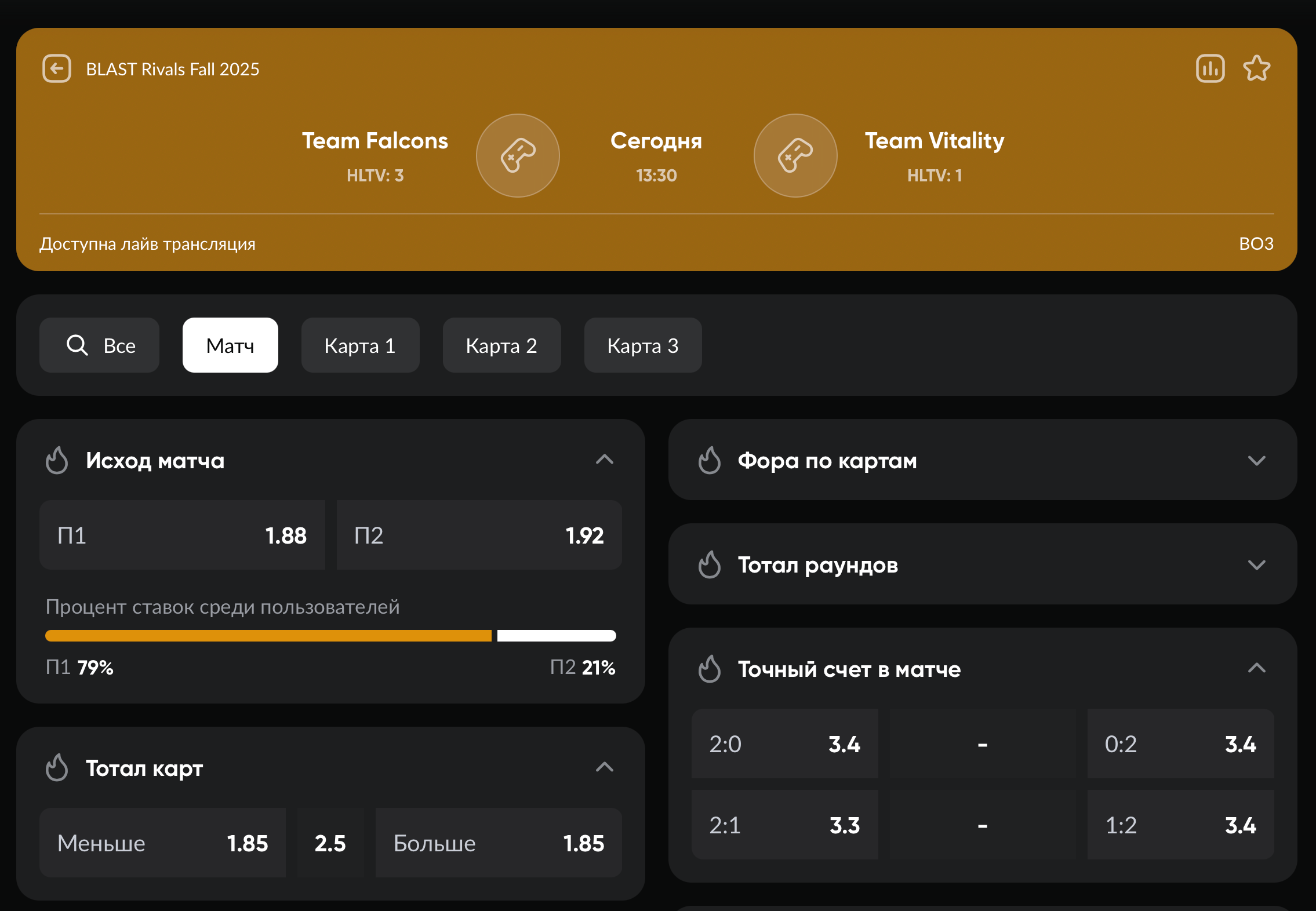 Falcons (1.88) против Vitality (1.92)